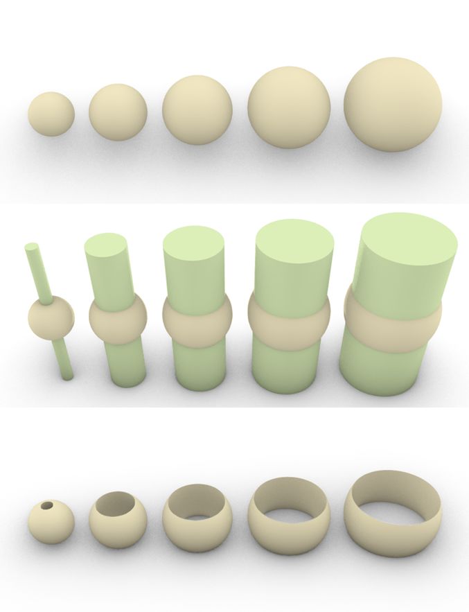 異なる大きさの球を並べて、円柱でくり抜く。