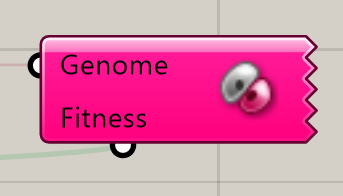 Galapagosコンポーネントの Genome をスクリプトへの入力に用いる値(スライダーコンポーネント)に接続する。Fitness をスクリプトの出力(評価値)に接続する。
